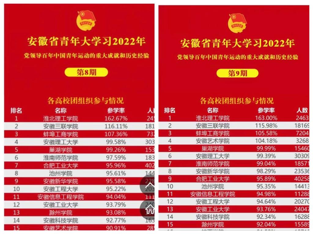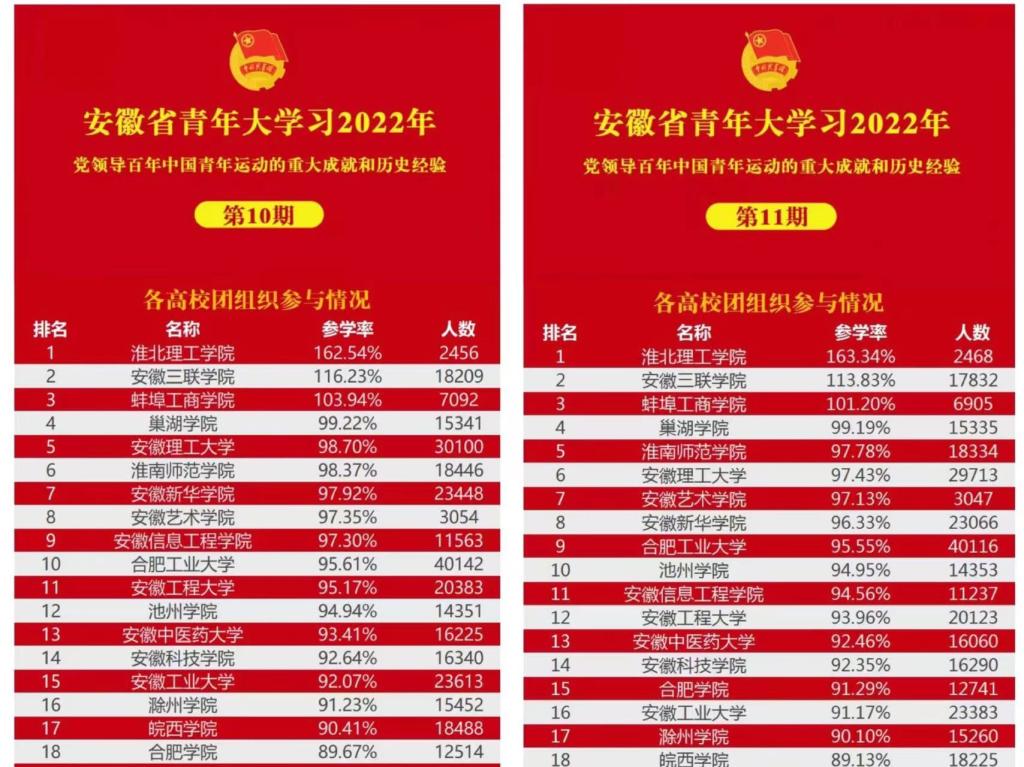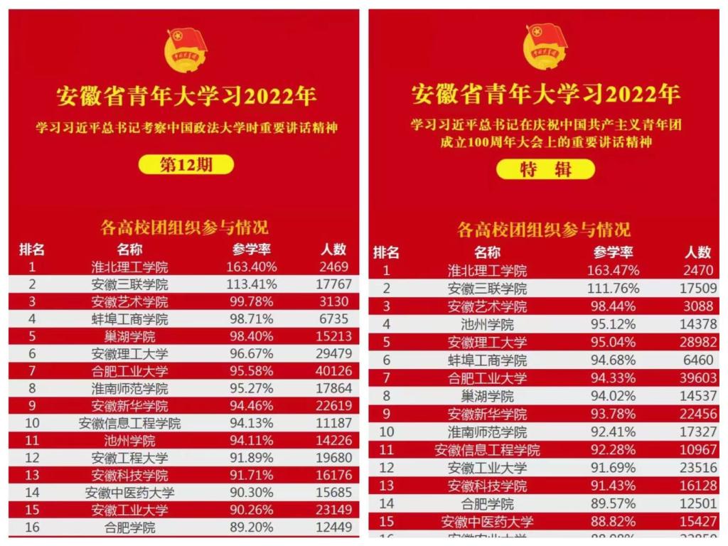 “青年大学习”是团中央加强青年学子理论武装和思想引领的重要举措,是深入学习贯彻习近平新时代中国特色社会主义思想和党的十九大精神、推动宣传思想工作的务实实践。5月23日,团省委公布的安徽省2022年特辑“青年大学习”中,Beat365官网以163.47%参学率荣登榜首,这已经是Beat365官网团委自第八期以来,连续六次位列全省第一。