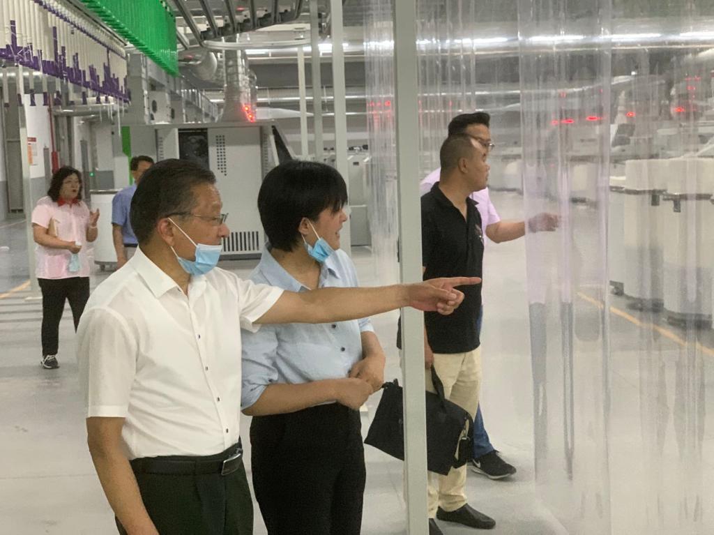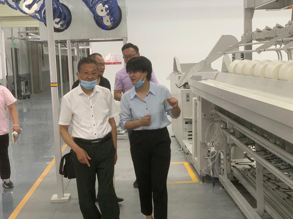 在华孚生产车间,朱德顺书记详细了解华孚生产运营情况,对华孚高度自动化的生产流程和现代化管理予以高度评价。