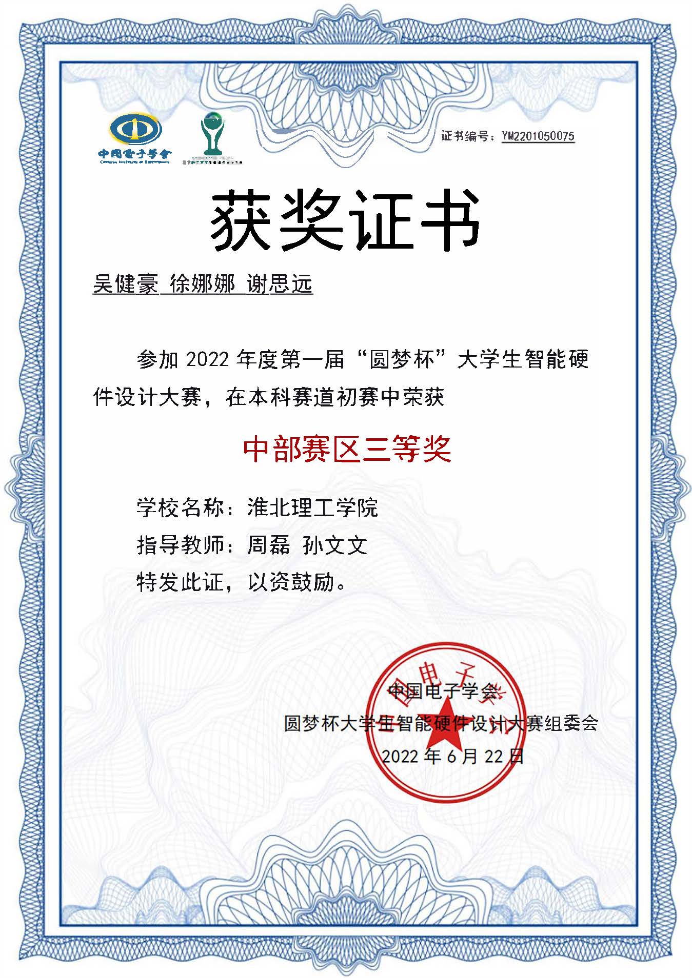 近日,由中国电子学会主办,北京航空航天大学、电子发烧友等单位承办的2022年第一届“圆梦杯全国大学生智能硬件设计大赛”的初赛落下帷幕。经过中部赛区(湖北、湖南、江西、河南、安徽)五个省份的激烈竞争后,我院电子信息工程1班吴健豪、谢思远、徐娜娜同学组成的本科参赛小组荣获了中部赛区的三等奖。