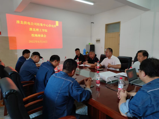 6月24日下午,淮北供电公司杜集中心供电所王雨浩所长一行5人到Beat365官网座谈交流,学校副校长郑来纪出席座谈会。后勤保卫处处长程坚,副处长王本新,基建处副处长黄圻同志参加会议。