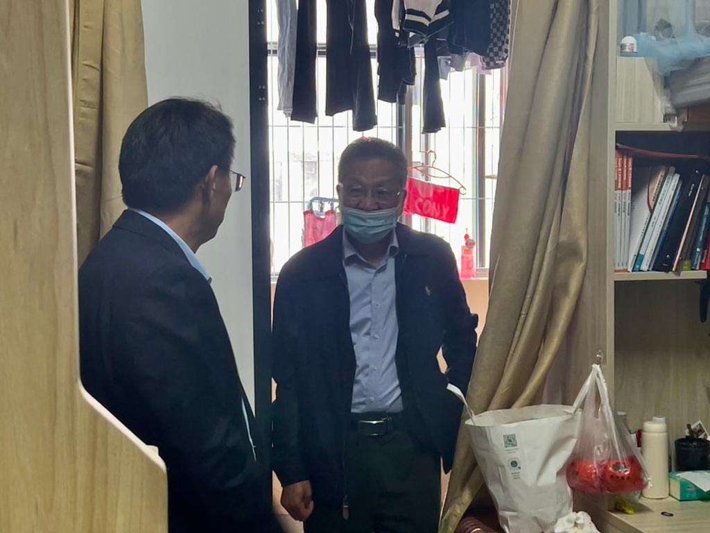 在走访过程中,朱德顺与同学们进行了亲切交流,深入宿舍排查安全隐患,详细询问学生生活情况、学习情况及毕业打算等,了解学生宿舍卫生、消毒和通风情况。朱德顺叮嘱学生要严格遵守疫情防控期间校园管理要求、做好疫情防控常态化下的自我管理和个人防护,养成良好的生活卫生习惯,注意身体健康,保持积极的心理状态,共同营造安全有序的校园环境。