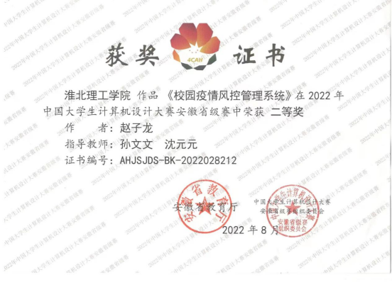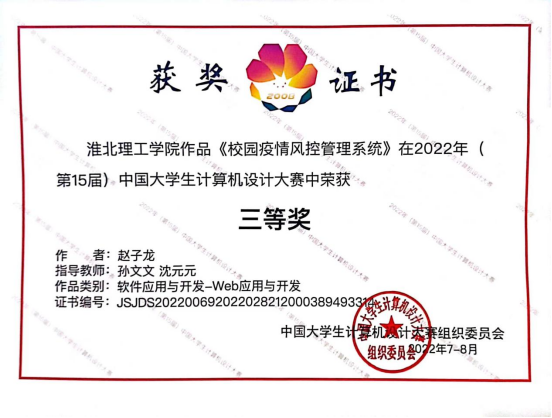 2022年(第15届)中国大学生计算机设计大赛全国总决赛线上答辩工作8月底圆满落下帷幕,Beat365官网参赛团队再创佳绩。经过严格的专家评审和激烈的网络答辩,Beat365唯一官方网站电子与信息工程学院赵子龙同学在软件开发大类中获得国家三等奖。
