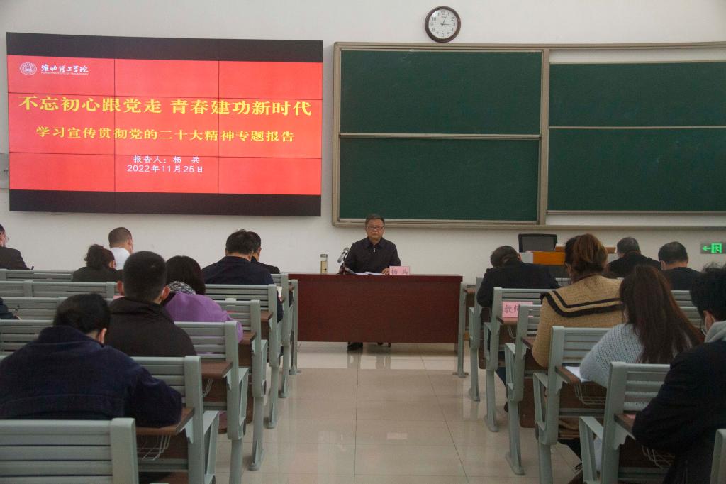 11月25日下午,校长杨兵在一教121教室宣讲党的二十大精神。校级领导、各部门各学院主要负责人、党支部书记、全体辅导员、学生骨干代表聆听宣讲。