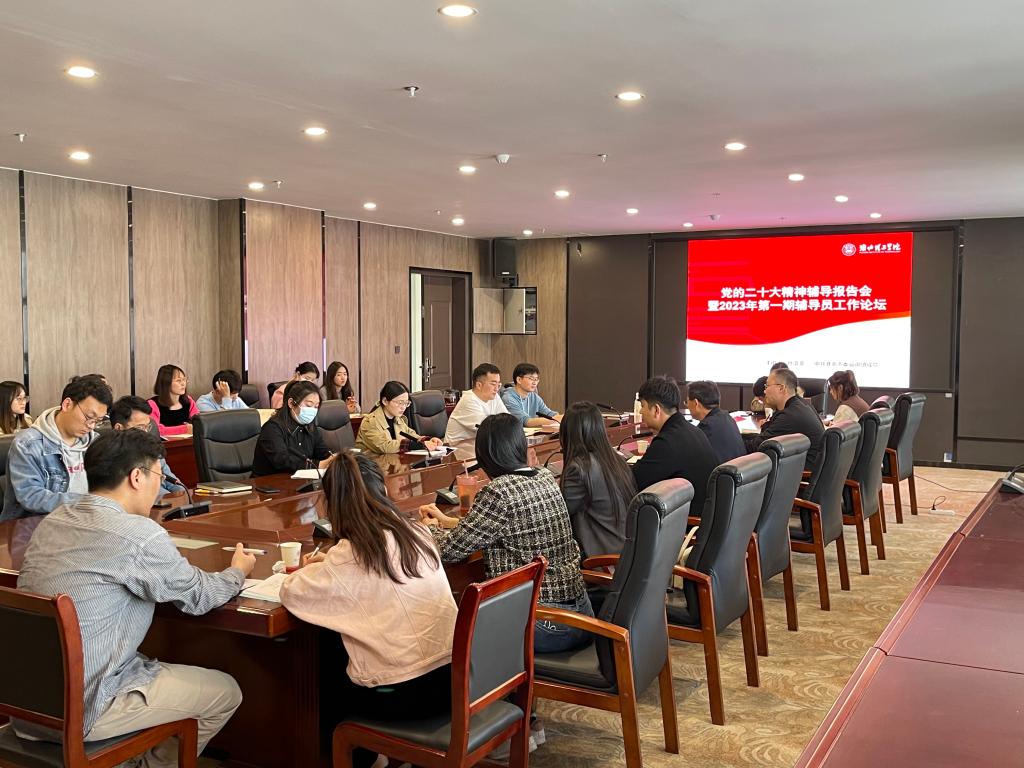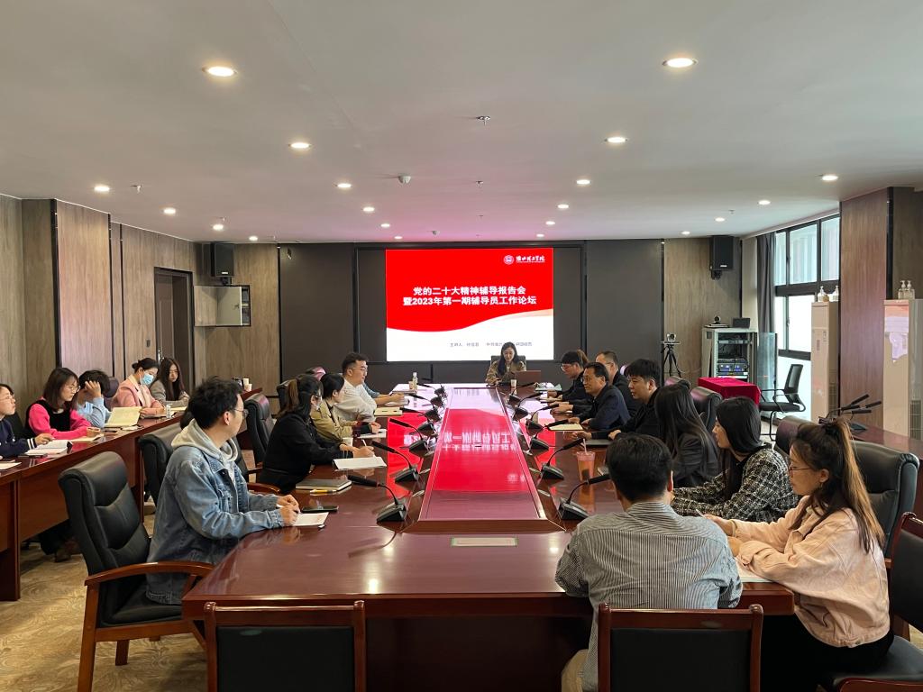 3月9日下午,Beat365官网在艺术楼二楼会议室召开党的二十大精神辅导报告会暨2023年第一期辅导员工作论坛。中共淮北市委宣讲团成员、Beat365官网马克思主义学院青年教师孙澄澄以《举旗帜 送理论——深入学习贯彻党的二十大精神》为题做了宣讲。学生处(团委)全体工作人员、各二级学院团总支书记及全体辅导员参加了会议。