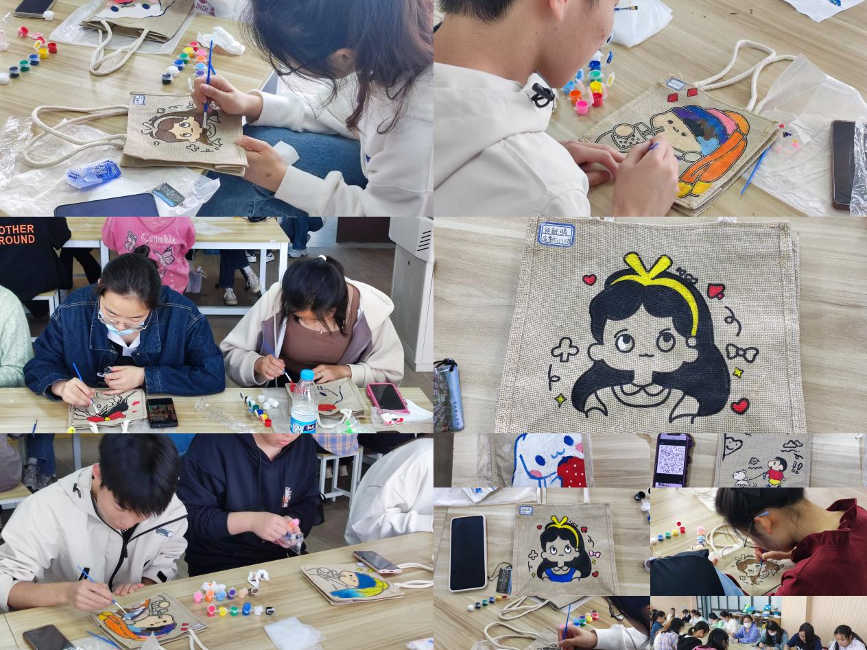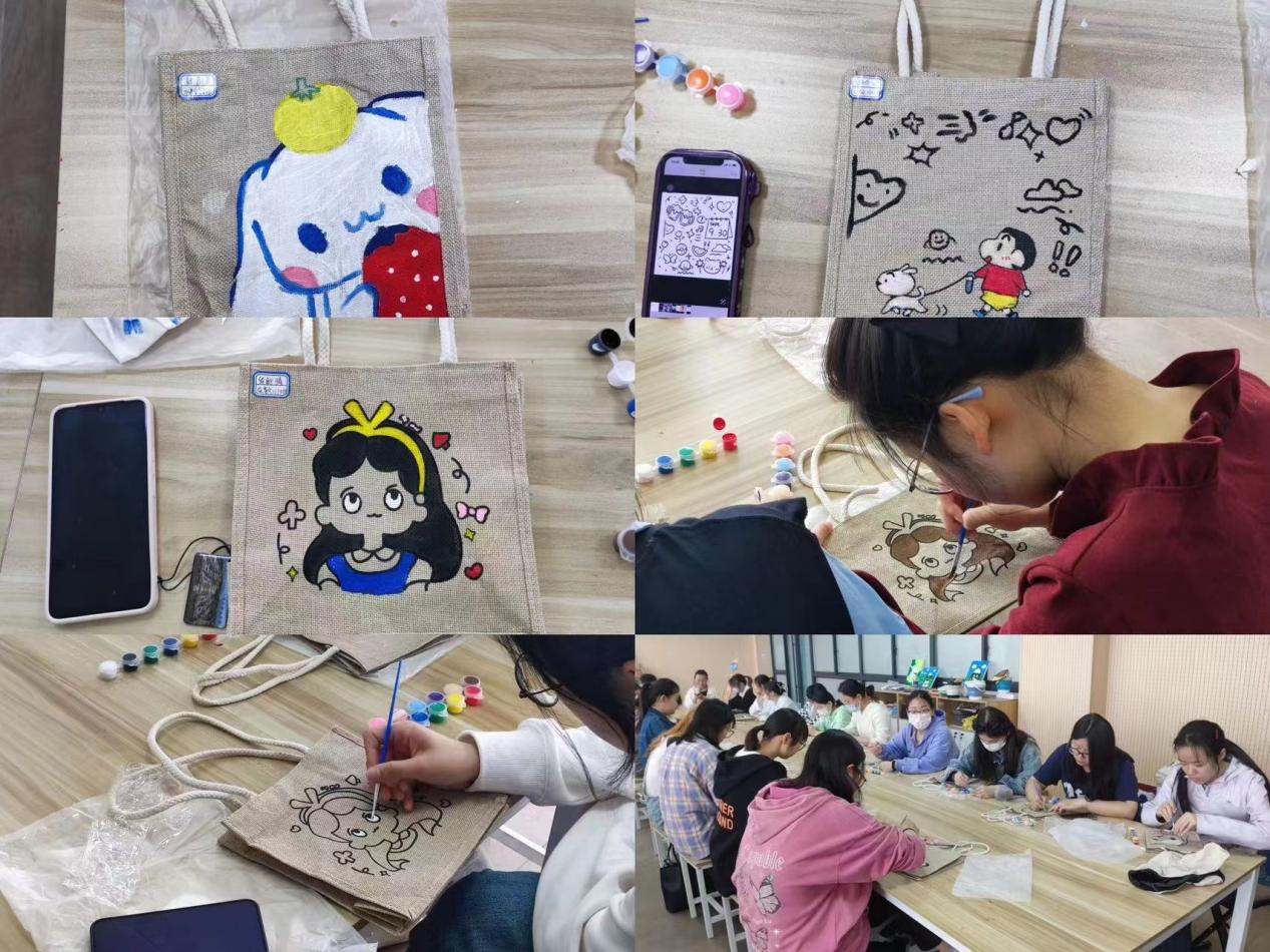 活动开始,首先由工作人员为参加活动的同学们分发布包、颜料、画笔等创作工具,引导同学们在创作、绘画过程中充分发挥想象力,利用现场提供的材料设计构思,将创意与思考结合,妙笔生花,用鲜艳的色彩和图案绘制出许多生动作品,营造了良好的校园文化氛围,对舒缓学习压力具有重要作用。