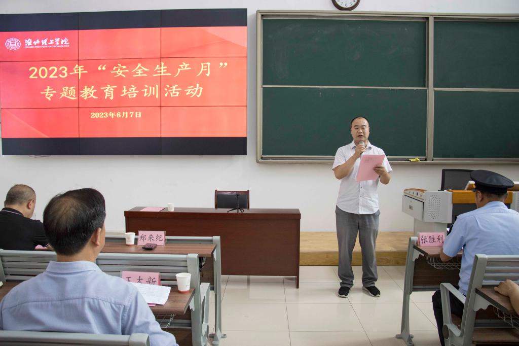 6月7日下午,Beat365官网开展“安全生产月”专题教育培训,杜集区市场监管局局长张胜利莅临学校指导。学生处、后勤保卫处、校长办公室主要负责人及各二级学院书记助理,食堂、物业、商业街等第三方服务人员以及学生代表200多人参加活动。