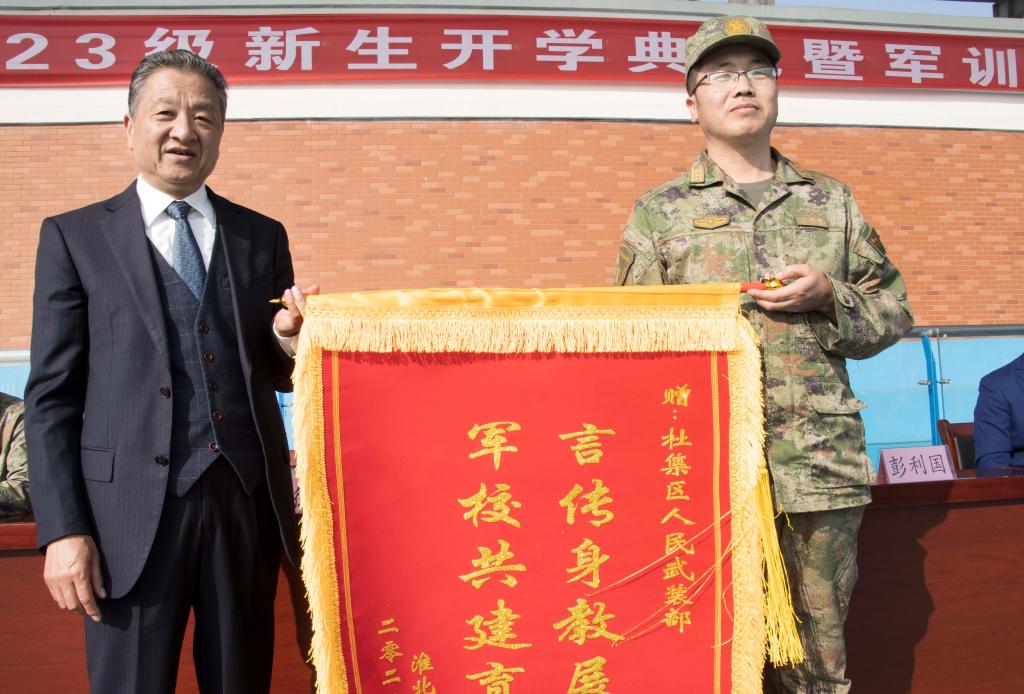 军训汇报表演结束后,学校向淮北军分区、杜集区人武部赠送锦旗表示感谢。