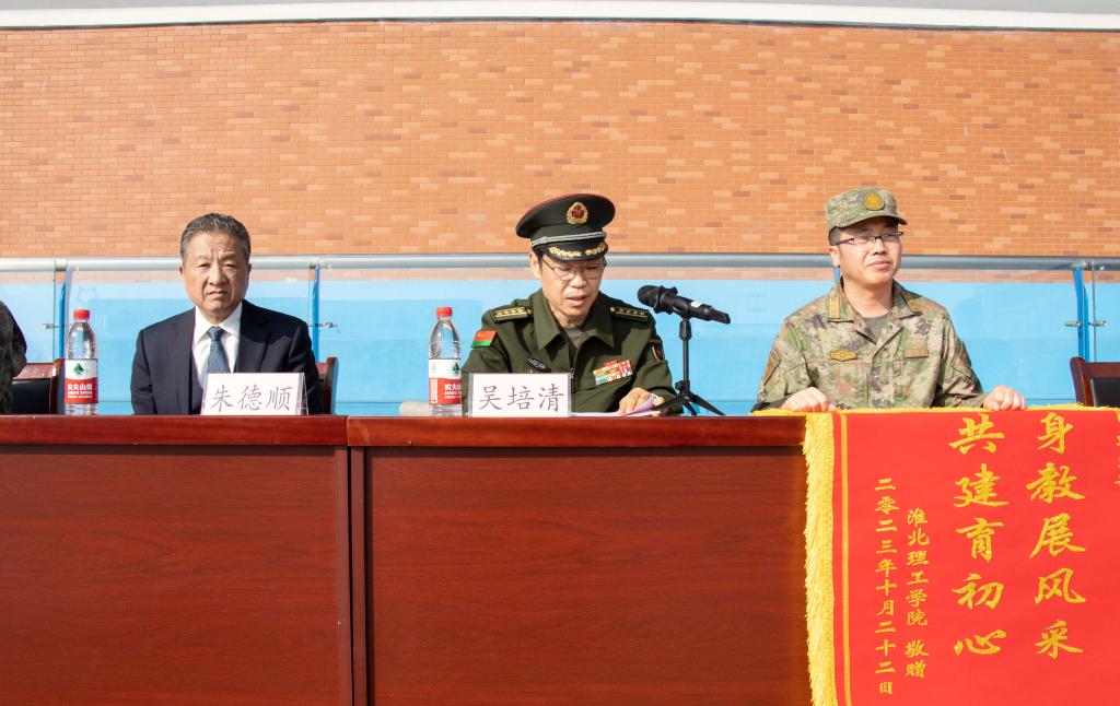 淮北市委常委、淮北军分区大校、政治委员吴培清同志讲话。他表示学校本次2023级新生军训工作组织严密、成果明显,基本达到预期目标。学校开办以来,对学生军训工作、对国防后备力量建设高度重视,充分体现了学校党委很高的政治站位、很强的国防意识。结合当前国际形势,吴培清同志叮嘱同学们要珍惜现在的美好时光,在高校的知识殿堂里学政治、学文化、学科技、学军事,努力使自己成为现代化强国建设的栋梁之才,成为军事强国建设的骨干力量,以实际行动报效国家。