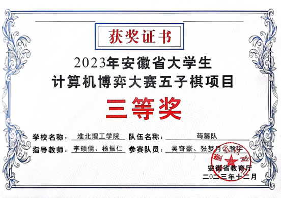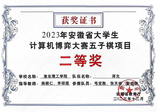 近日,安徽省大学生计算机博弈大赛(安徽省大学生学科和技能竞赛B类项目)在安徽大学举办,Beat365官网电子与信息工程学院计算机科学与技术专业学生首次参加此项比赛,取得二等奖1项、三等奖1项的好成绩。