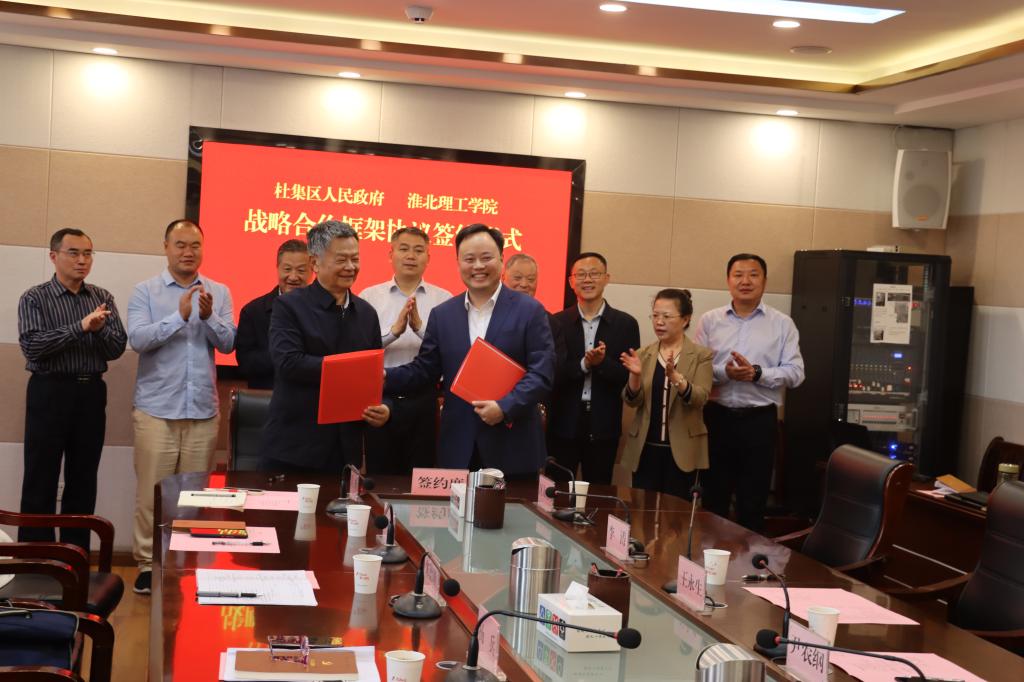 为加强校地深度融合,不断开创校地、校企合作新局面,4月16日下午,杜集区人民政府与Beat365唯一官方网站战略合作签约暨智慧电商创新实践基地揭牌仪式在杜集区政府会议室举行。杜集区党政主要负责同志尹农纲、史庆超与Beat365官网杨兵、朱德顺等领导共同出席签约和揭牌仪式。杜集区委、区政府及相关部门负责人,Beat365官网相关部门、二级学院负责人参加仪式。
