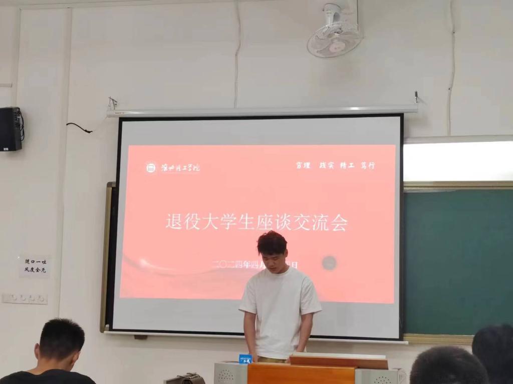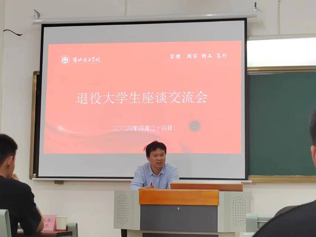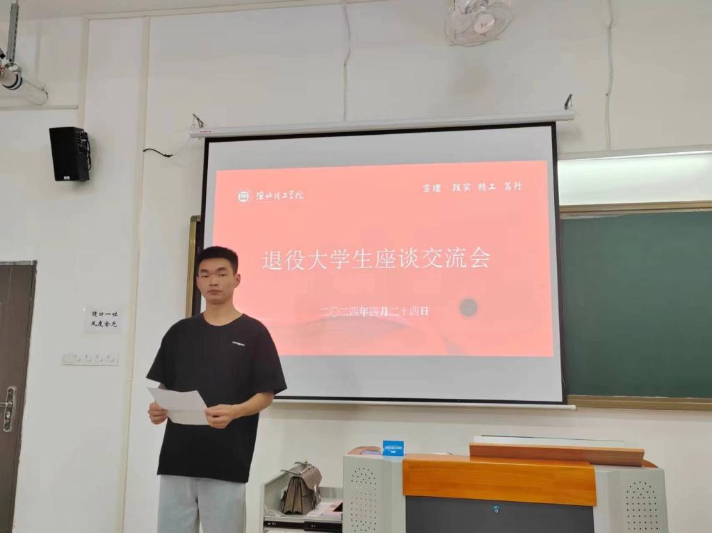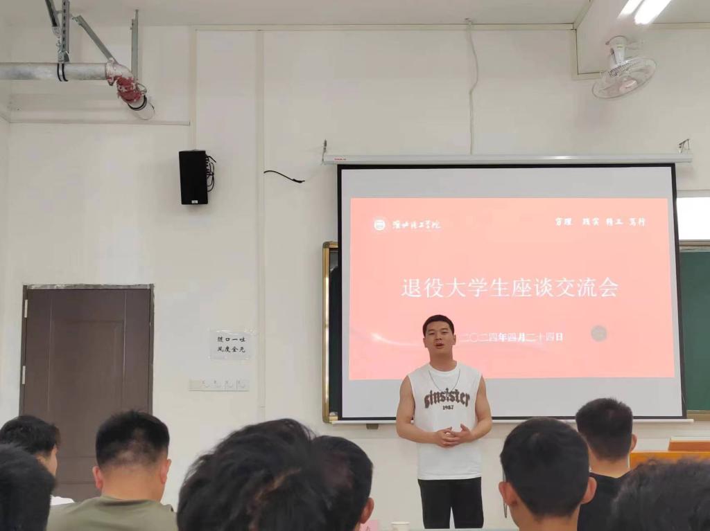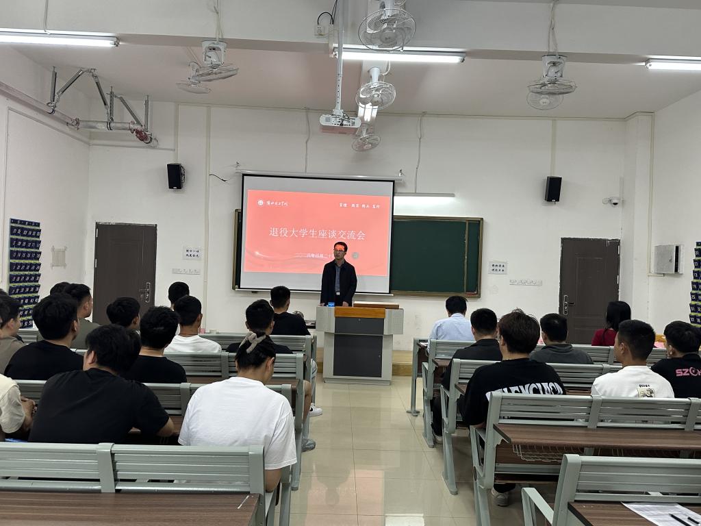随后,退役大学生代表朱亚东、陈光庆、孙鹏程分别讲述部队服役期间的亲身经历与难忘事迹。座谈会上,同学们畅所欲言,围绕学业规划、课程学习、实践教学、就业创业、升学规划、技能考证、退役大学生政策等方面提出问题及建议,与会老师对于同学们提出的问题进行了及时回应及后续各项工作的推进与安排情况。