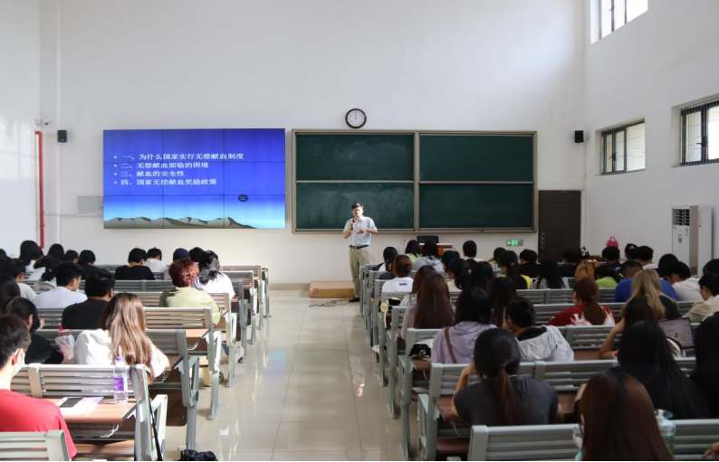 献血活动前夕,为了让同学们在活动前对无偿献血拥有足够的了解与认识,淮北市无偿献血办公室主任、副站长代长青为同学们作了以“血液可以再生、生命不会重来”为题的血液健康知识专题讲座。讲座中,代长青从为什么国家实行无偿献血制度、无偿献血面临的困境、献血的安全性、国家无偿献血奖励政策等方面进行了全方位的讲解。讲座极大地激发了同学们的献血热情,使同学们对血液知识和无偿献血有了正确的认识,更将“捐献可以再生的血液,挽救不可重来的生命”的意识深深烙印在了心里。