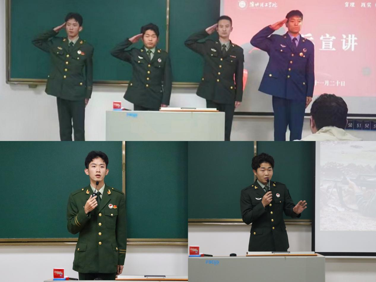 在二教208教室的宣讲会上,退伍大学生代表祁俊杰、张子晨、吴嘉奇、罗健为学生们解读了今年征兵的条件和相关政策,尤其是学生最为关心的大学生应征入伍可享有的升学优先、补偿学费和退役后享受就业优惠等优抚政策。他们鼓励大学生要敢于有梦、敢于追梦、敢于圆梦,让青春在军营的历练中、在为祖国的奉献中闪光。随后,他们向大家介绍了部队的生活和训练情况,军队的生活使他们收获了远大的理想信念,坚强的意识、良好的行为习惯和强健的身体素质。在分享过程中,退役士兵们纷纷呼吁广大同学们珍惜青春年华,勇敢地到军营中追逐梦想,到百炼成钢的熔炉中磨砺青春。他们用自己的亲身经历诠释了入伍的价值与意义,激发了同学们对军营生活的向往和憧憬。