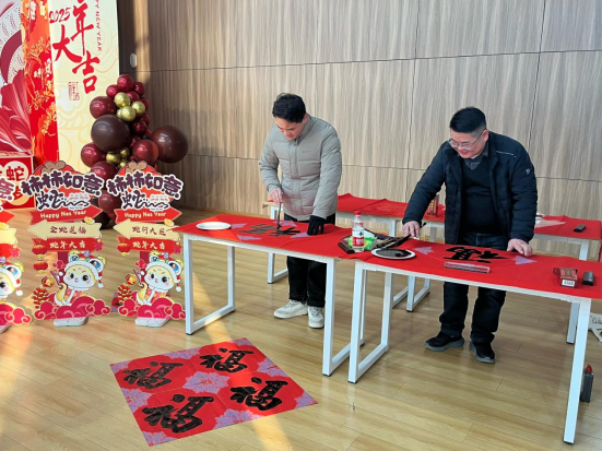 现场还特别邀请教育学院秦祥老师、淮北尚贤书院书法高考培训中心朱立强老师拿起毛笔为教职工们送来祝“福”。