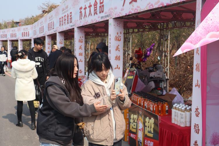本次活动紧密围绕直播电商与市场营销专业特色,采用“双人轮播+场景化导览”模式。14名学生分为7组,每日上下午轮换穿梭于杏林花海、民俗展演区及特色农产市集,通过镜头实时展示杏花盛景、非遗技艺及乡村美食。