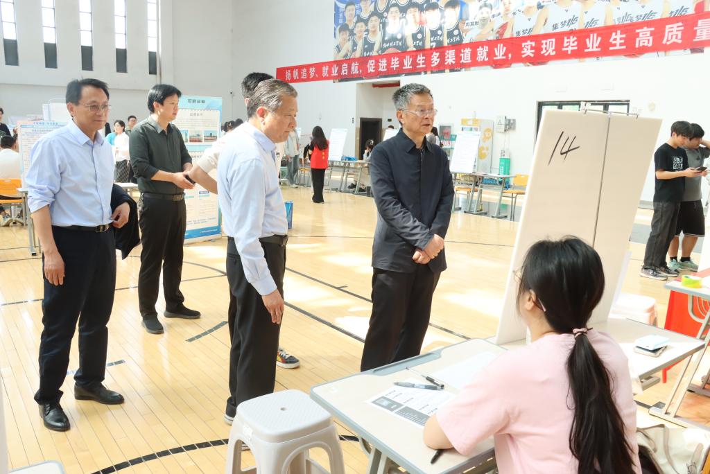 为全面贯彻教育部“春季促就业攻坚行动”部署,抢抓春季校园招聘关键期,全面促进2025届毕业生高质量充分就业,学校于4月18日举办2025届毕业生春季校园双选会。校长杨兵、党委书记朱德顺、副校长郑来纪亲临双选会现场指导工作。