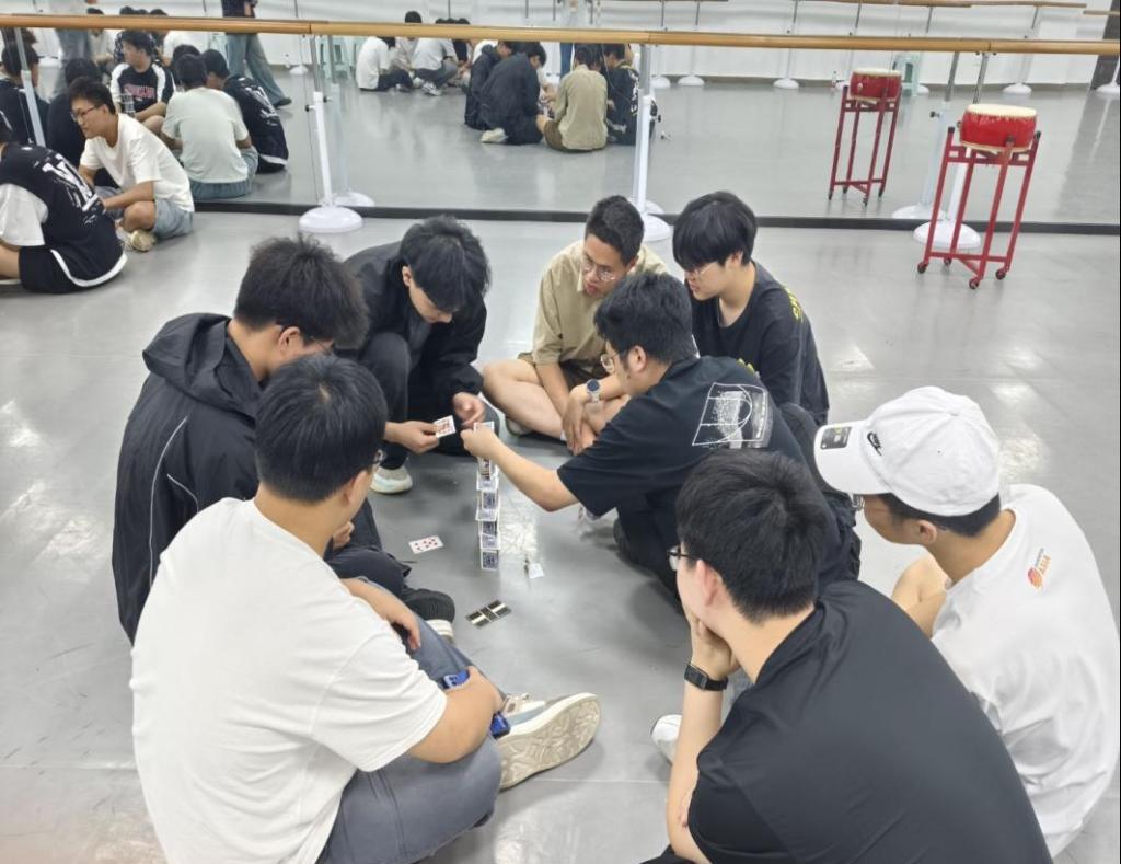 活动以“以劳健心”为核心理念,通过行动实践与团队协作的创新结合,借助团辅活动中的四个环节设计实现育人效能升级。开场环节,带领者以“几人几脚”打破学生隔阂,迅速构建信任开放的团体氛围。“纸牌塔塔”挑战中,同学们分组将纸牌搭建转化为协作实践,通过结构构思、精准搭建等分工,在任务中强化团队默契与问题解决能力;“乐器砰砰砰”环节更将劳动教育与美育深度融合,学生利用空瓶、纸箱等材料手工制作创意乐器,完成曲目合奏。活动尾声,成员们写下心愿与祝福,分享告别。