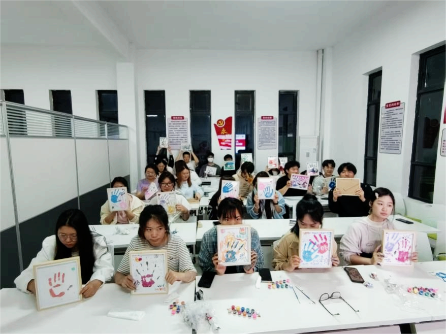 “手印相框”活动以指尖印记镌刻时光美育力。同学们以颜料拓印手型,辅以彩绘与创意装饰,将个人印记转化为艺术符号。参与者通过自由创作与互动分享,在色彩碰撞中释放压力,于手作温度中凝聚心灵能量,让每一道掌纹都成为自我接纳与情绪表达的生命注脚。