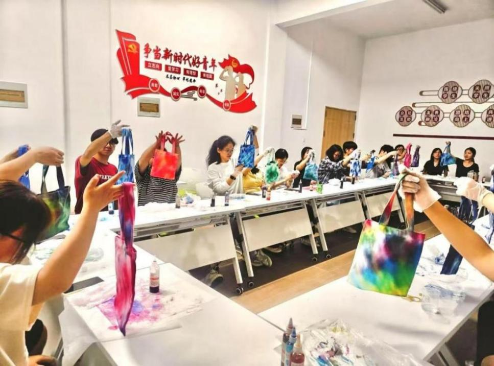 “扎染”活动以靛蓝流韵晕染自然美学力。学生沉浸于绞扎、浸染等传统工艺,在素白布包上以蓝靛为墨,让经纬纹路化作晕染的笔触,看苍白底色渐次绽放出星辰大海般的奇幻纹样。这场传统工艺与心灵疗愈的邂逅,让自然美学的滋养持续润泽心灵,在课业与成长的奔忙中辟出一方沉静的治愈空间。