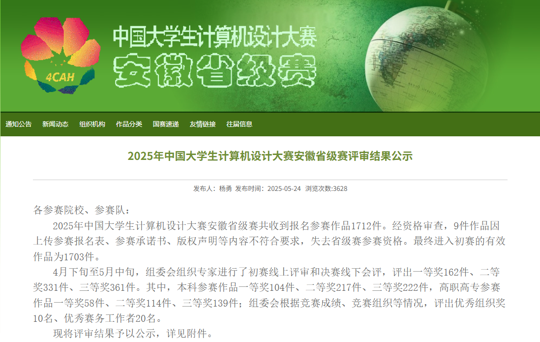 Beat365官网电子与信息工程学院学子在2025年中国大学生计算机设计大赛安徽省级赛中表现亮眼,凭借扎实的专业功底与创新实践能力,斩获多项荣誉。本次大赛中,我院学生共获得一等奖3项、二等奖3项、三等奖1项。取得了获一等奖数在全省参赛的43所本科高校并列第9名好成绩。其中4项作品被推荐参加在7月和8月份举行的全国总决赛。