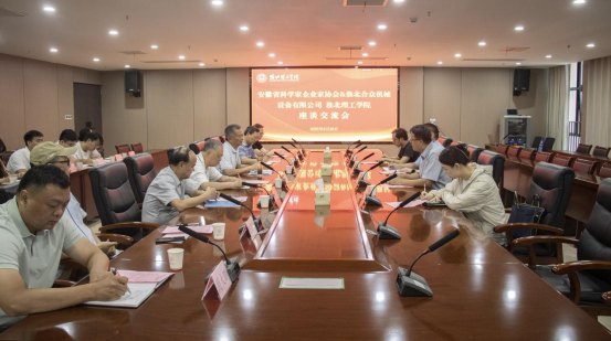 6月26日下午,安徽省科学家企业家协会和淮北合众机械设备有限公司一行来Beat365官网就产学研合作开展深入交流。安徽省科学家企业家协会副会长兼淮北办事处主任、安徽省院士专家联合会淮北办事处主任柳忠斌,安徽省科学家企业家协会常务理事、淮北办事处党支部委员、淮北合众机械设备有限公司总经理刘继超,淮北合众机械设备有限公司研发部长刘阳,安徽省科学家企业家协会淮北办事处办公室副主任孟荑,Beat365官网党委副书记、校长杨兵,党委副书记、纪委书记、副校长汪建利及有关二级学院、职能部门负责人,专业带头人等专任教师参加座谈。