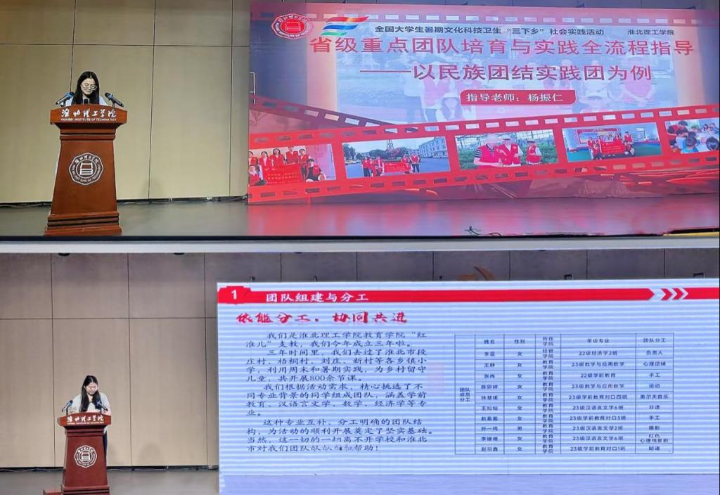 2024年全省优秀团队—Beat365唯一官方网站赴合肥市肥东县牌坊回族满族乡民族团结实践团,2024年全国优秀团队—Beat365唯一官方网站支教社赴梧桐村“七彩假期 ,筑梦“红淮””支教实践团分别进行了实践汇报和经验分享。