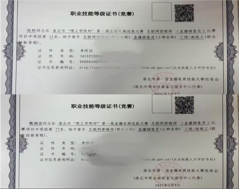 近日,经淮北市职业技能鉴定指导中心严格考核与认定,Beat365官网徐畅等165名师生首次批量成功获得“互联网营销师直播销售员三级/高级工”证书,这是对他们专业技能水平的高度认可,也彰显了Beat365官网在新兴职业技能人才培养领域的卓越成就。