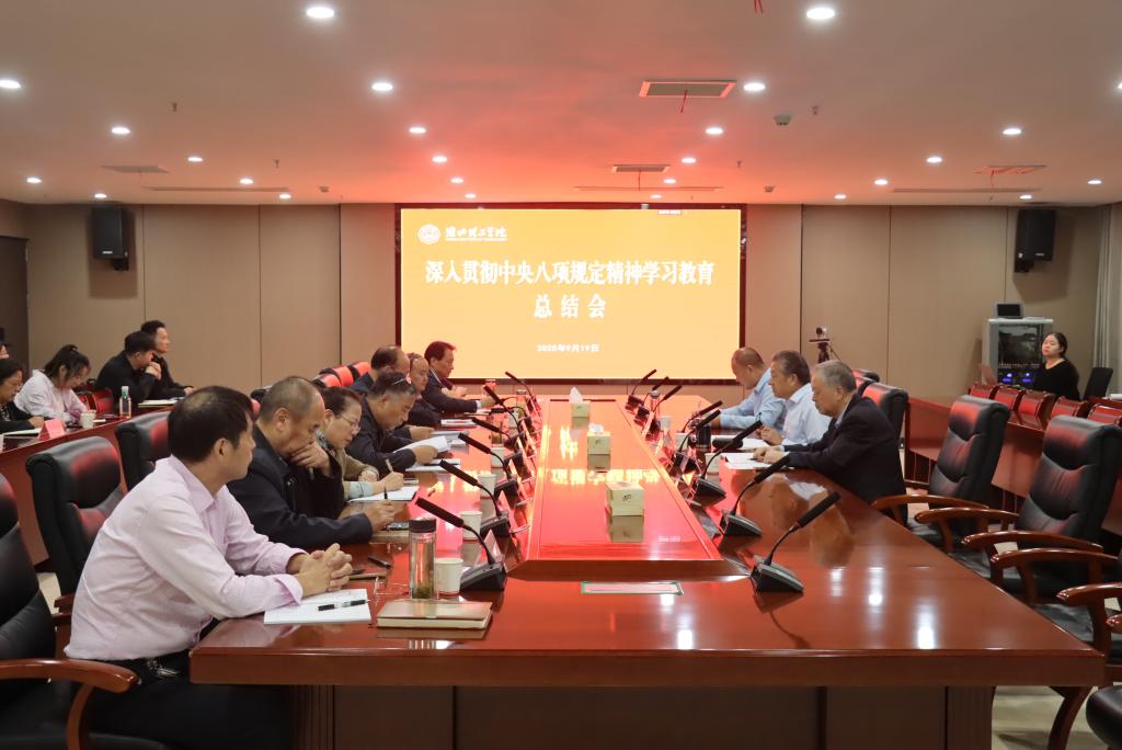 会议传达学习中央、省委和省委教育工委深入贯彻中央八项规定精神学习教育相关文件精神和重要工作部署,总结学校深入贯彻中央八项规定精神学习教育取得的成效和存在的不足,部署巩固深化学习教育成果、推进作风建设常态化长效化工作。
