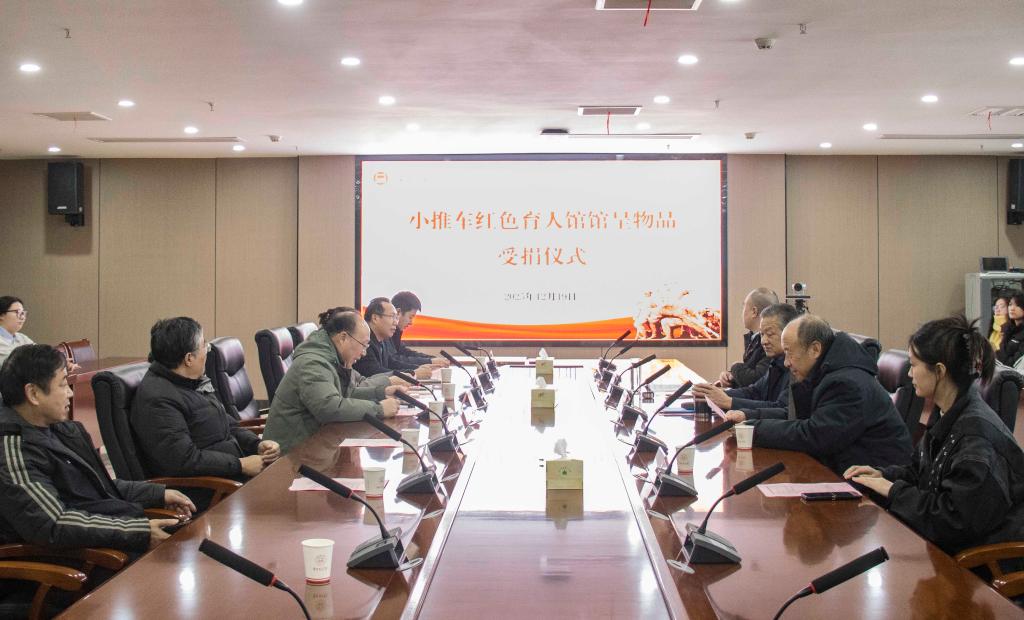 郑来纪代表学校接受捐赠。此次捐赠包含煮酒铝壶、子弹壳、支前相关竹篮子、笆斗等34类共计58件珍贵实物。这些藏品全方位、多角度还原了革命年代的战斗与支前风貌,不仅大幅丰富了小推车红色育人馆的馆藏品类与数量,更为学校开展沉浸式、场景化的红色文化教育提供了珍贵的实物支撑。