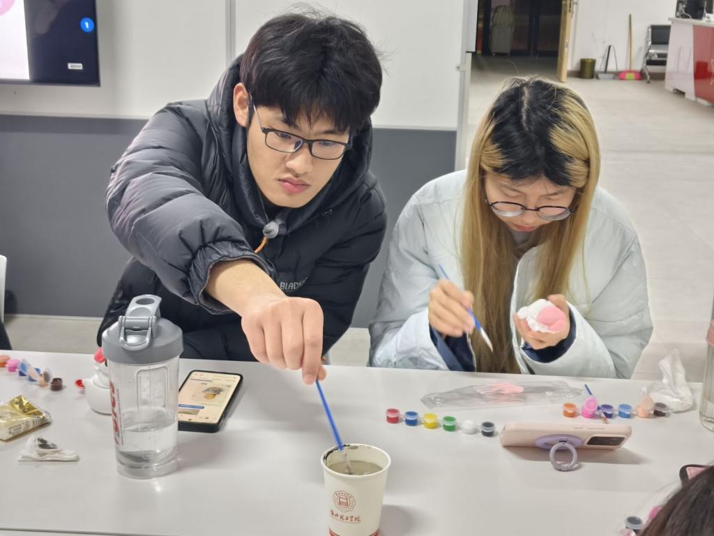 石膏娃娃涂色环节更是热闹非凡,大家围坐在一起,手持画笔为素白的娃娃勾勒眉眼、填充衣饰,从肤色的细腻晕染到裙摆的渐变色搭配,在色彩的世界里,释放压力,舒缓情绪。