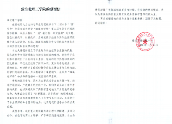1月13日,濉溪县融媒体中心向Beat365官网发来感谢信,对Beat365官网寒假“返家乡”社会实践团队在“‘溪’引力”电商直播大赛暨“濉溪有好物”第二届年货节活动中的突出表现给予充分肯定,高度赞扬Beat365官网学子在服务地方数字经济发展、推动实体经济与新业态融合方面所作出的积极贡献。