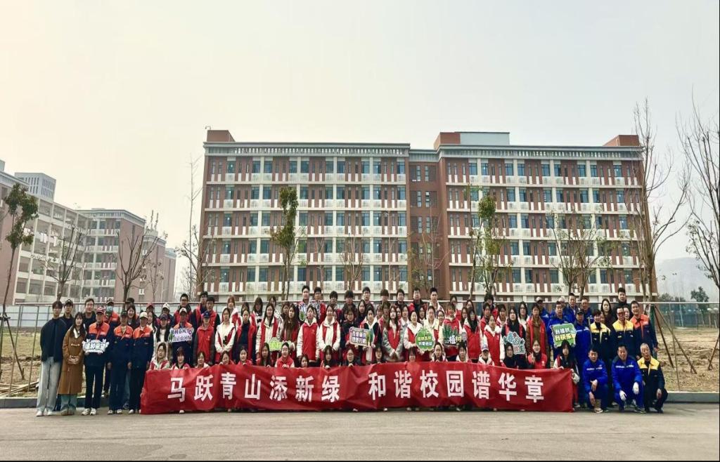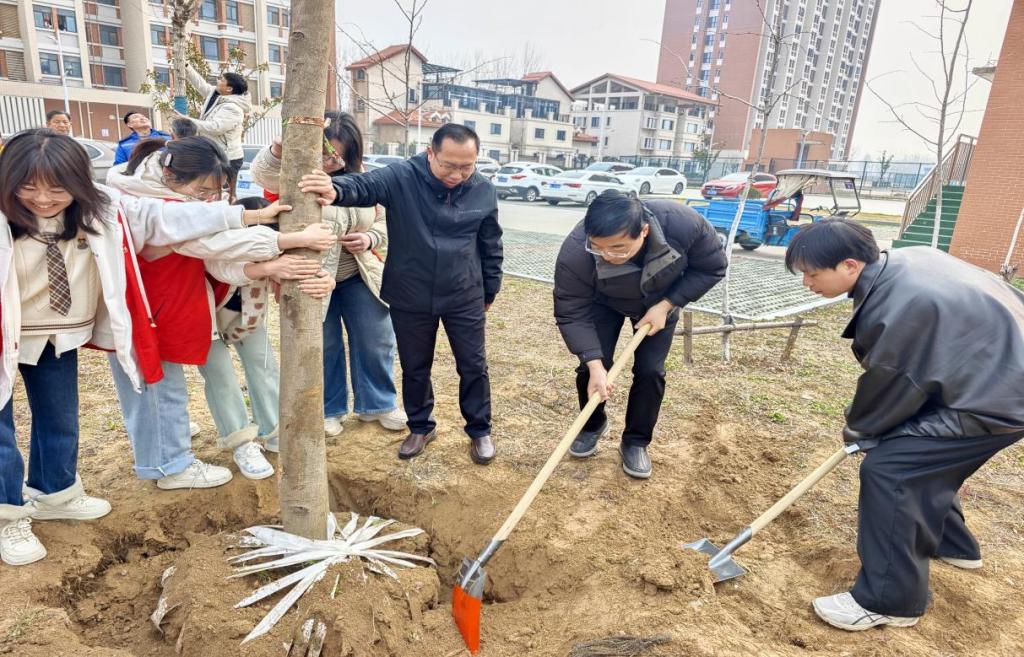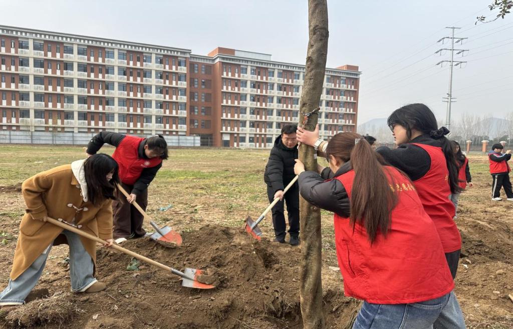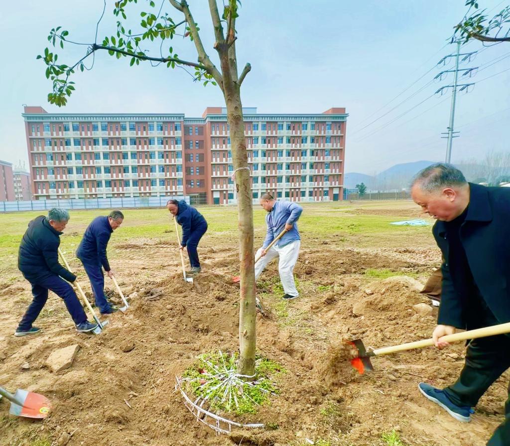 植树现场,学校领导和师生们分工合作,齐心协力,共同挥锹铲土、开穴立苗、培土围堰、回填踩实,一株株树苗扎根校园、迎风挺立,为学校增添了一抹抹新绿。