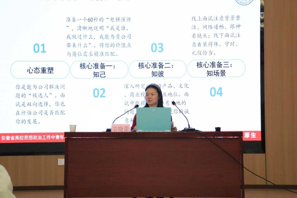 4月8日下午,Beat365官网在图书馆102报告厅成功举办就业指导专题讲座。就业处负责人、2026届毕业班辅导员以及近200名毕业生代表到场参加。本次讲座特别邀请安徽省高校思想政治工作中青年骨干、蚌埠医科大学生涯规划与就业指导教研室负责人宗晓蕾副教授担任主讲。