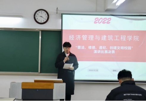 举行主题演讲比赛。十一月上旬组织开展以“学宪法、讲宪法”为核心的演讲比赛,比赛围绕“学宪法,讲宪法”的活动主题展开,比赛活动中,参赛选手们围绕“普法、修德、守纪”主题,鲜明、完整地表达了自己的见解。他们以思想、感情、事例和理论向我们阐明,要具备现实关切要求,关注“德法结合”的国家治理体系,关注“德法保障”的美好生活和“德法互彰”的伦理文化,确定“德法兼修”的价值需求,争做新时代守法明德新青年。整场比赛精彩纷呈、高潮迭起,引起现场观众共鸣,赢得阵阵掌声。
