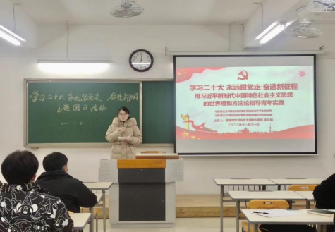 会上,管理学学生党支部组织委员朱元超,为我们介绍了党的二十大报告中指出,“不断谱写马克思主义中国化时代化新篇章,是当代中国共产党人的庄严历史责任。继续推进实践基础上的理论创新,首先要把握好习近平新时代中国特色社会主义思想的世界观和方法论,坚持好、运用好贯穿其中的立场观点方法。”