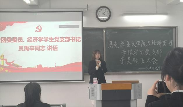 4月7日中午,马克思主义学院与经济管理学院学生支部于2教422召开二十大主题学习暨党员转正大会,讨论预备党员刘恩惠、闫瑞同志转正事宜。学院党总支书记助理、团总支书记叶赵强同志特邀参会,经济学学生支部书记员禹辛、青年委员王绎程、管理学学生支部书记石园园、青年委员张雨停及学生支部83名党员参会。大会由学生党支部组织委员刘良晨主持。