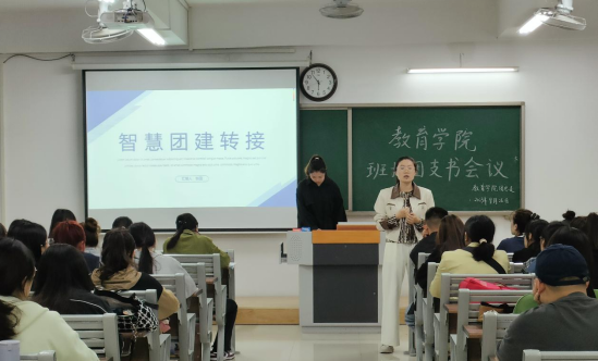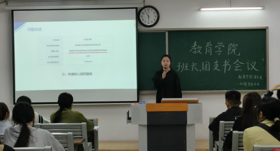 为进一步强化学生干部队伍建设,发挥学生干部模范带头作用,促进学院学生管理工作的有序开展,9月26日下午,教育学院在1号教学楼520教室召开2023级学生班级班长、团支书培训会。学院分管副书记孟向红、书记助理黄莹莹、团总支副书记许海涛、2023级全体辅导员以及2023级全体班长、团支书参加了本次培训会。