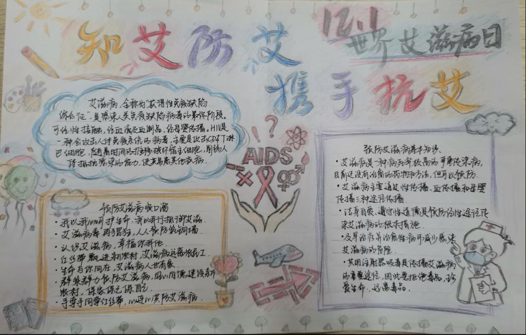 经过几天的精心制作,一幅幅手抄报作品被绘制出来。这些作品充分展示了同学们在本次防艾活动中的收获,不仅锻炼了他们的排版、抄写、美工、收集材料等多方面的综合能力,更提高了他们对艾滋病的认识、明确了大学生在抗击艾滋病中的作用和责任。