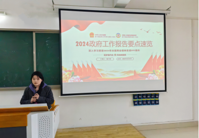 随后,秦子倩同志领学政府工作报告、两会热词与两会期间习近平总书记重要讲话精神。围绕两会的最新动态和热点议题进行介绍。通过梳理政府工作报告中的关键点,解读与大学生息息相关的政策导向,聚焦教育、就业等领域的新举措、新目标,让大家进一步深入了解两会内容。