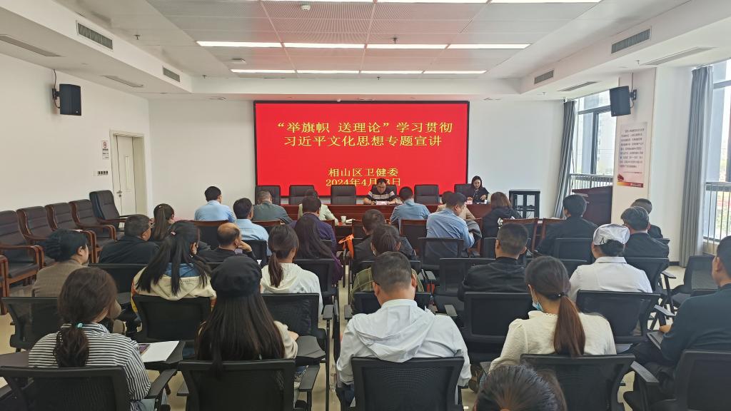 4月23日下午,淮北市相山区卫生健康系统“举旗帜·送理论”学习贯彻习近平文化思想宣讲报告会在相山区人民医院召开。马克思主义学院孙澄澄作为淮北市委宣讲团成员,受邀作题为《深入学习贯彻习近平文化思想·加快建设繁荣兴盛的文化强市》的宣讲报告。相山区卫生健康委班子成员全体参会,相山区卫生健康委党委书记柳泰主持会议。