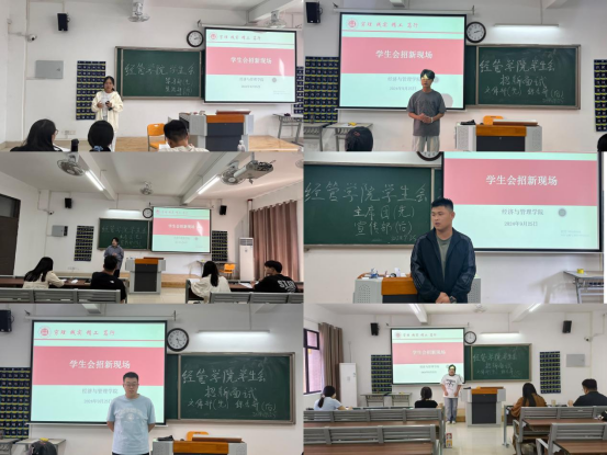 2024年9月25日下午,经济与管理学院在二教415、416、417教室成功举办了一场别开生面的学生会招新面试活动,旨在为学生会注入新鲜活力,优化组织结构,并提升整体干部队伍的素质与能力。评委由书记助理叶赵强、团总支书记员禹辛及辅导员王绎程、张雨停、刘子恢、石园园、徐瑞鲜、郑凡、焦乙皓、韩心影和李慧娴组成。本次招新分三组进行,通过自我推介和考核答辩的方式对竟参同学进行选拔。