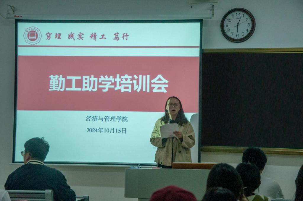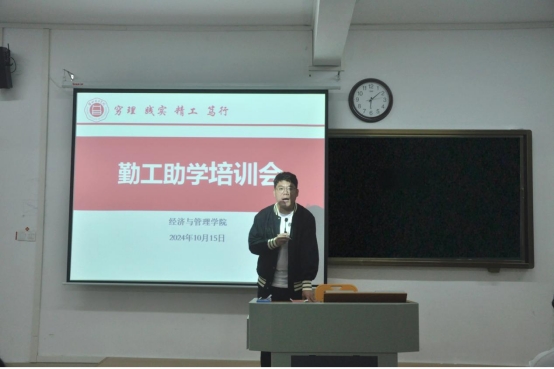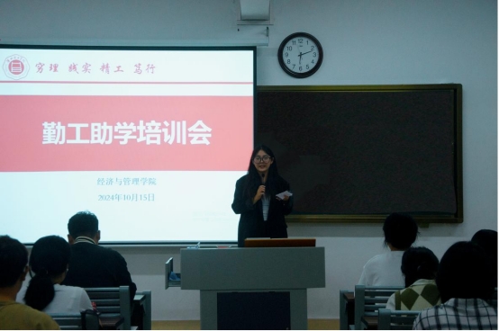 为规范勤工助学工作,经济与管理学院于10月15日晚在1教221教室举办了勤工助学培训专题会议。书记助理叶赵强、实训室主任李健、学院负责劳动与卫生的徐瑞鲜、刘子恢老师、以及负责督导和检查的院学生会生活部部长余昌松,今年秋季录用的75名勤工助学学生参加本次会议,会议由学生会袁怡玟主持。