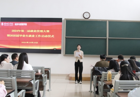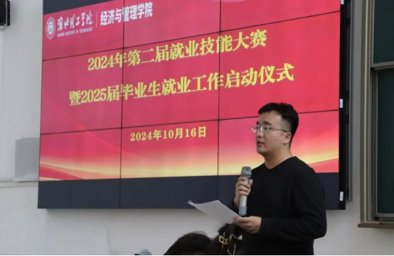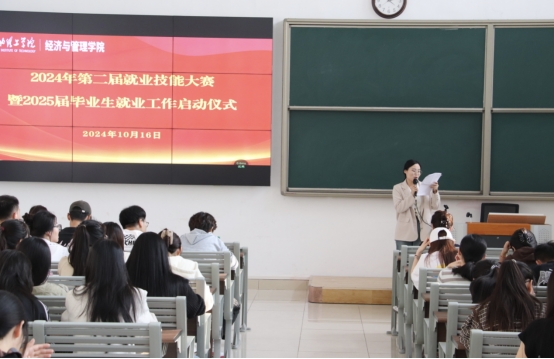 为进一步增强我院学生的就业竞争力,提升职业素养与实践能力,促进理论知识与就业市场的深度融合,经济与管理学院于10月16日下午在一教121开展“第二届就业技能大赛暨2025届毕业生就业工作、校企合作月启动仪式”。学院党总支书记、院长吴玲,书记助理叶赵强,各专业教研室主任、毕业班辅导员以及全体2025届600多名毕业生参加本次活动,处长助理李魏代表学生处(就业处)参加了启动仪式。本次活动分两场分别由郑凡和范红玲主持。
