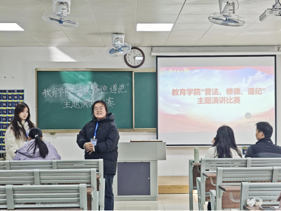 为落实学校“关于开展2024年‘普法、修德、遵纪,创建文明校园'专项活动的通知”精神,促进同学们更好地做到“学法懂法守法”,让立德树人理念更加深入人心,教育学院于11月27日在1号教学楼206、207教室举办“普法、修德、遵纪”主题演讲比赛。此次比赛由2024级班主任老师担任评委。