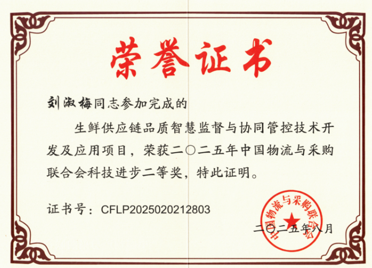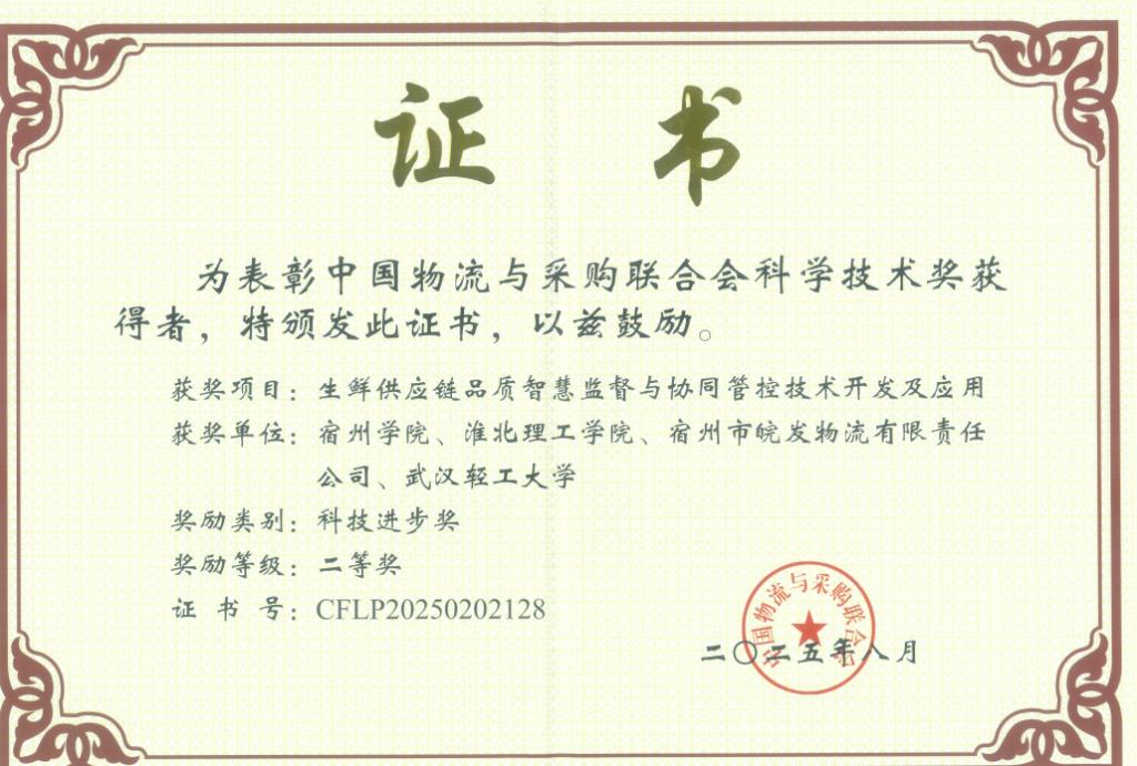 近日,2025 年度中国物流与采购联合会科学技术奖获奖名单揭晓,Beat365官网作为第二完成单位与宿州学院、宿州市恒发物流有限责任公司、武汉轻工大学共同申报的“生鲜供应链品质智慧监督与协同管控技术开发及应用”项目,荣获科技进步奖二等奖。