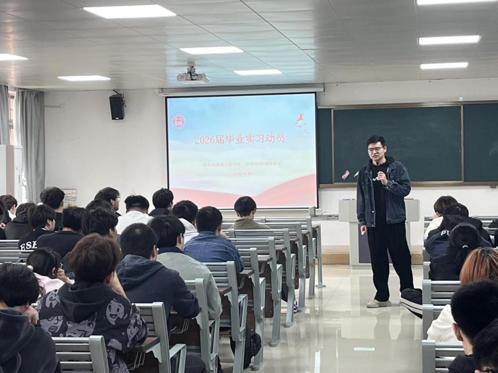 近期,机电与建筑工程学院在一教320召开2026届毕业生实习动员大会,院长助理陈家乐、就业实习指导老师、毕业班辅导员及2022级自动化专业、2022级机械设计制造及其自动化专业全体学生等参加了动员大会。本次动员大会由自动化教研室主任朱鑫磊老师主持,围绕毕业实习的整体安排、具体要求及注意事项进行了全面讲解。