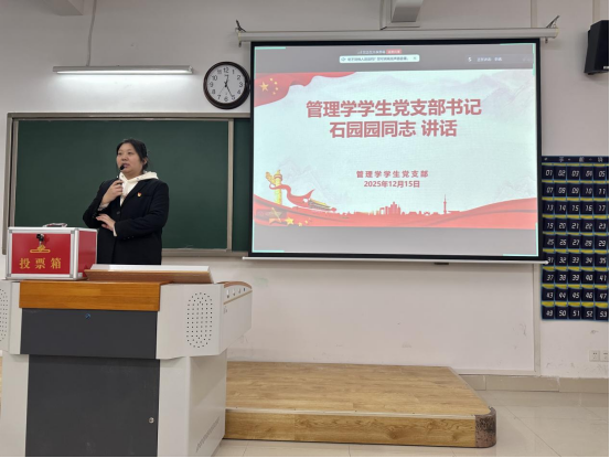 2025年12月15日,经济与管理学院管理学学生支部在二教508顺利召开预备党员转正大会,讨论并表决沙汀新等5名同志的转正申请。支部书记石园园、学院党总支纪检委员叶赵强出席会议,支部全体党员参加。会议由王艺桐同志主持。
