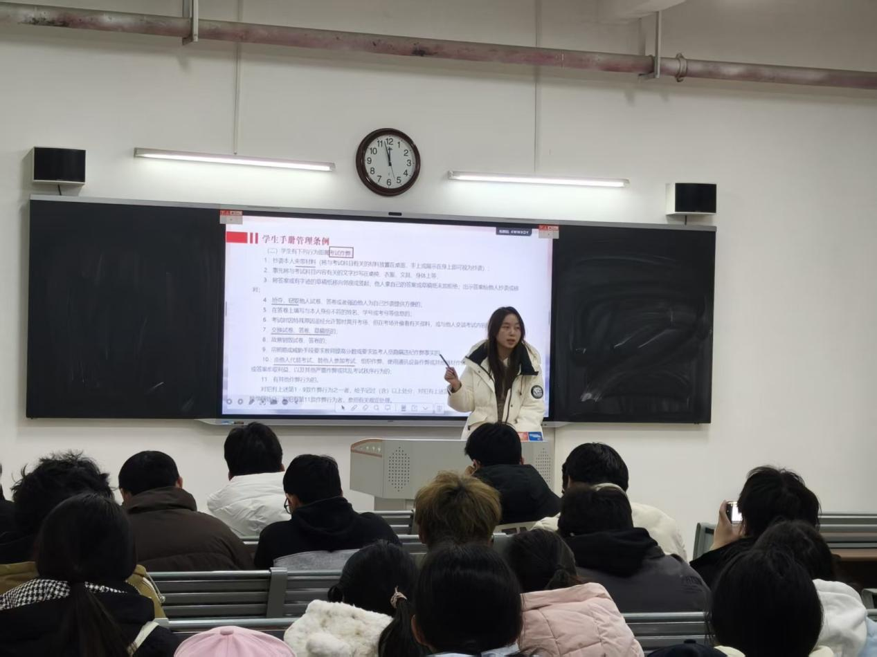 各班级班会通过多种形式,深入学习《Beat365唯一官方网站全日制普通本科学生学籍管理细则》、《Beat365唯一官方网站学生违纪处分办法》等相关规章制度,明确考试违规行为的认定标准和相应处分措施,包括考试违纪、考试作弊等,让学生意识到考试作弊带来的严重后果:一次作弊行为,不仅会导致课程成绩无效,受到纪律处分,更会在个人档案中留下无法抹去的污点,影响未来的升学、就业乃至人生发展。