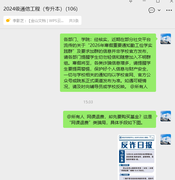 为进一步落实立德树人根本任务,筑牢期末学生管理安全防线,近日,电子与信息工程学院组织全体辅导员扎实推进“进宿舍、进班级、进网络”工作,围绕期末考试、心理安全、防范电信诈骗三大重点,精准发力、多措并举,为学生健康成长保驾护航。