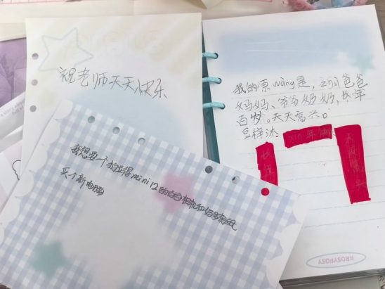 支教活动尾声,志愿者们为各位小朋友分发了精心准备的“心愿本”,鼓励小朋友们写下心中的美好期许。随后,学院领导和老师们共同为孩子们分发支教社捐赠的爱心礼物。一份份满载关怀的物资,让冬日的氛围暖意融融。